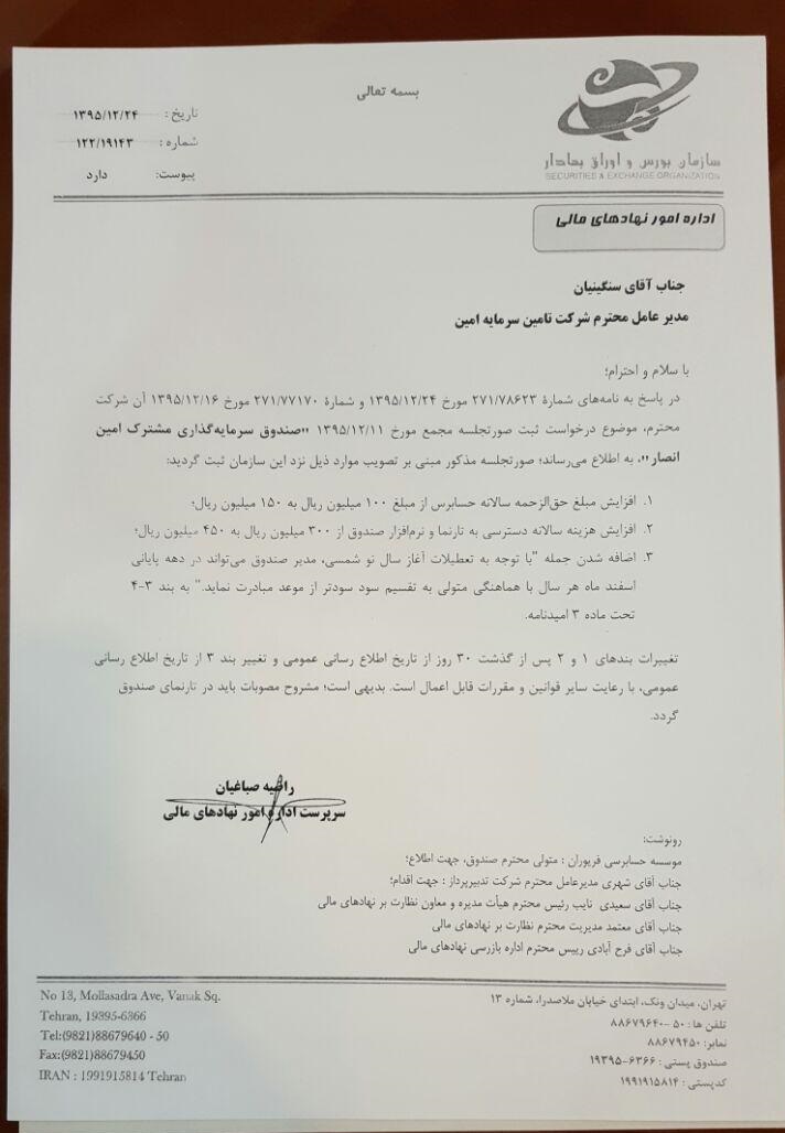مجوز سازمان بورس ( افزایش سقف صندوق امین انصار )